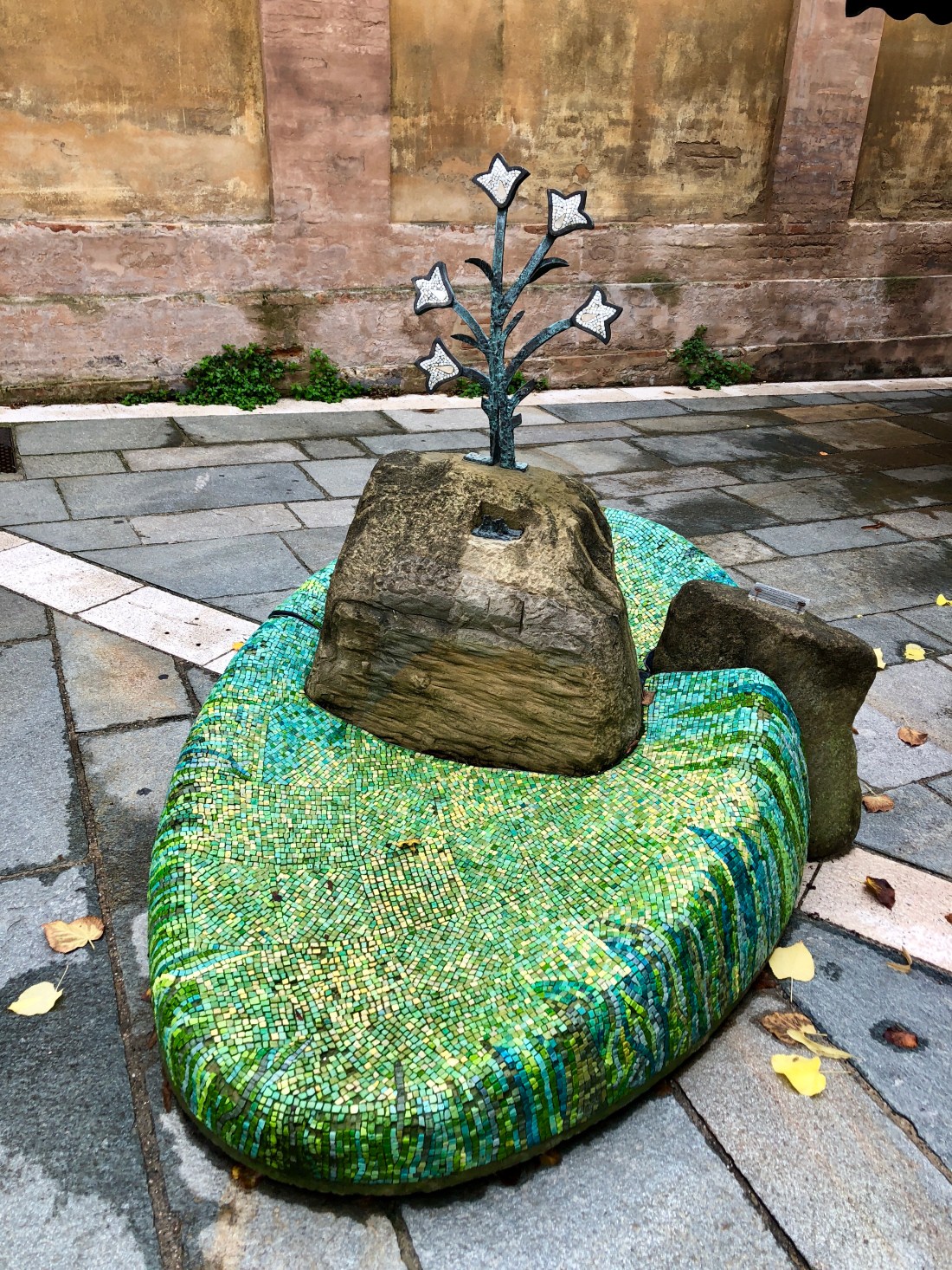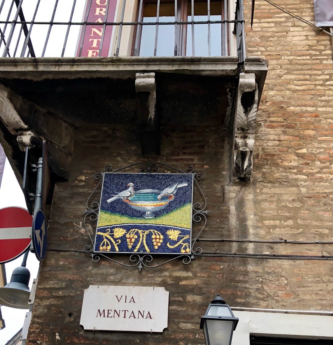 Es war immer noch grau und hat ab und zu genieselt, als wir am Morgen durch Ravenna spazierten. Ich hatte bereits in unserer Unterkunft süß und mit Tee gefrühstückt, der Hase aber braucht morgens etwas herzhaftes – idealerweise ein Käsebrot – und so fanden wir uns recht schnell in einer Bar wieder, wo er ein Focaccia-Sandwich zum Milchkaffee aß, während ich an einem Smoothie nippte. Dann liefen wir weiter durch die Altstadt Ravennas und begegneten schon überall den Mosaiken, für die die Stadt bekannt ist.