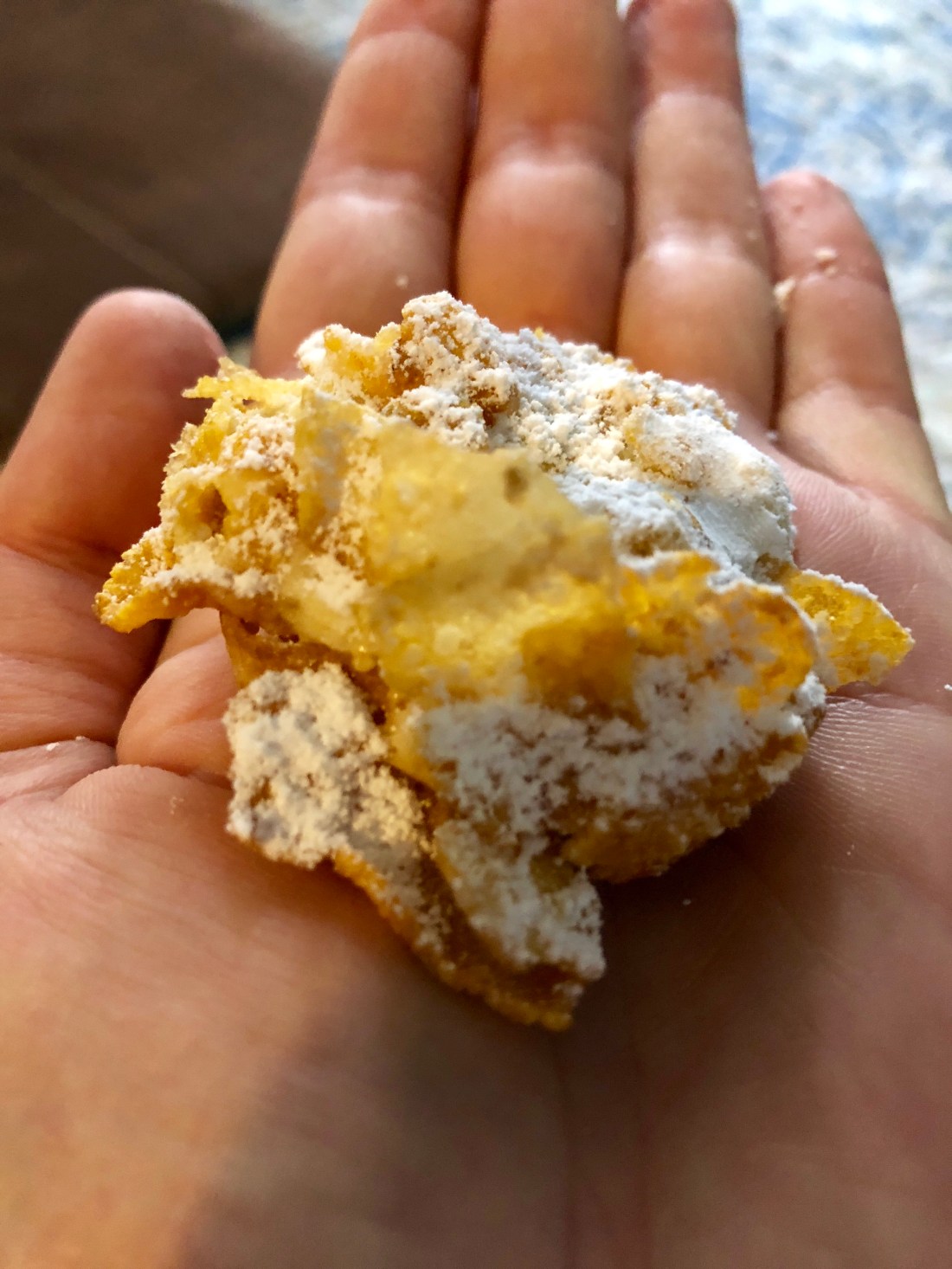 Wir spazieren also einfach nur gemütlich durch die Altstadt und sparen uns den Fahrradausflug entlang der Lagune oder zum Strand. Stattdessen finden wir bald eine kleine Osteria, aus der laut Bob Marley schallt und bekommen da einen Aperitivo mit einem Spritz mit Vermouth, gerösteten Kartoffeln, Crostine mit süßsauren Sardinen und Chips. Danach laufen wir weiter die Gassen ab auf der Suche nach einem Restaurant, dass lokale Küche serviert und weder zu touristisch, noch zu teuer aussieht. Das von unserem Gastgeber empfohlene Nachbarschaftslokal ist nämlich heute leider geschlossen. Die Osteria, die wir schließlich finden, ist dann auch schön versteckt und voller italienischer Familien, allerdings gibt es auch eine deutsche direkt am Nebentisch und eine zweisprachige Karte. Nun ja, man kann nicht alles haben. Geschmeckt hat es trotzdem. Es gab für den Hasen gebackene Sardinen, für mich gebackene Jakosmuscheln, für ihn Spaghetti mit cozze und vongole und für mich Bigoli mit Sardinen. Dazu gibt es einen Pinot Grigio (den vino bianco della casa) und zum Nachtisch gönne ich mir noch ein Blätterteigtörtchen („scriglio“) mit Creme und frischen Früchten, der Hase hingegen ist müde und möchte nur noch ins Bett.