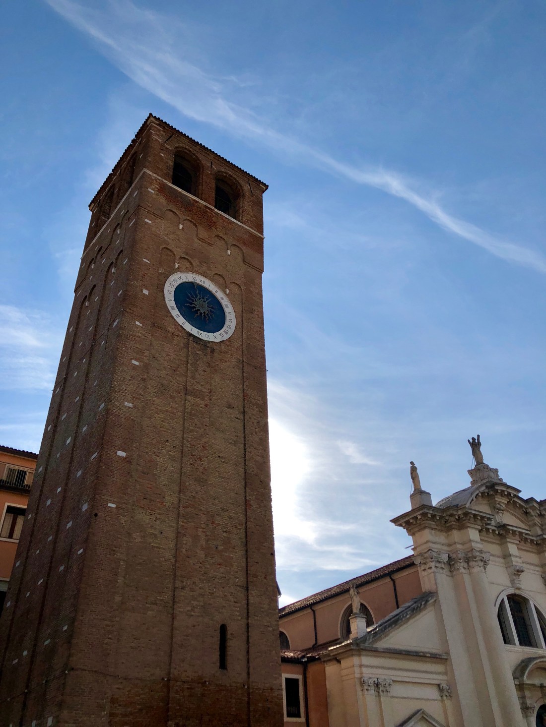 Von dort aus laufen wir mit Sack und Pack zu dem Treffpunkt, den unser Gastgeber uns genannt hat. Da werden wir bereits von seiner halben Familie erwartet. Sie laden unser Gepäck ins Auto und während seine Eltern das Auto zur Wohnung fahren spazieren wir mit dem Gastgeber selbst am Wasser entlang dorthin und bekommen eine erste Einführung in die Geographie der Stadt. Wir bekommen das Fischgrätenmuster der Gassen erklärt, erfahren etwas vom Kampf der Einheimischen gegen das Aufstellen riesiger Gastanks nur wenige hundert Meter von bewohnten Häusern und über die angeblich älteste Uhr der Welt, die den Glockenturm von Chioggia ziert.