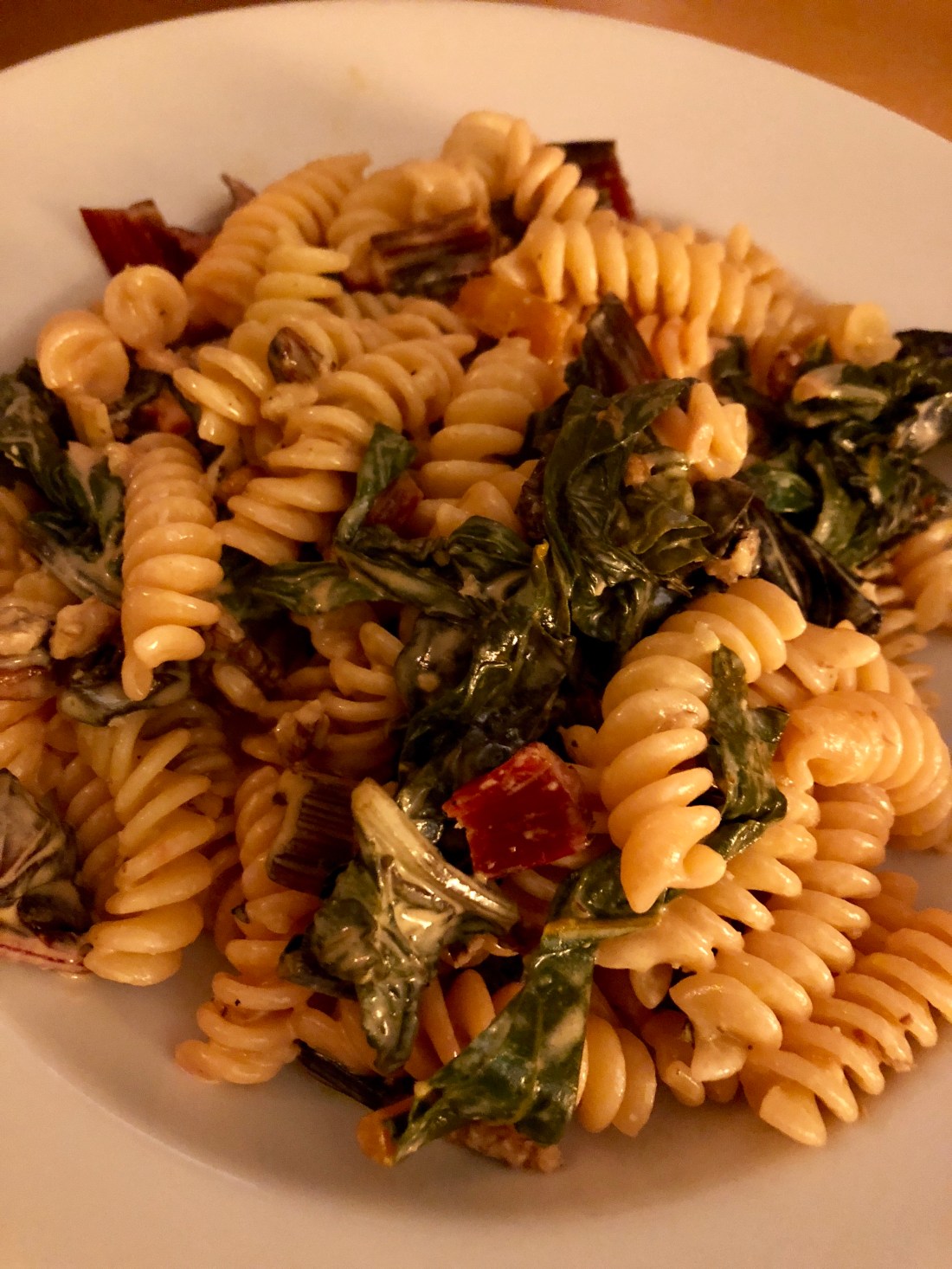 Viertel 7 mache ich Feierabend und fahre auf direktem Weg nach Hause. Kurz vor 7 komme ich an. Erst einmal bekommen die Katzen ihr Futter und ich ziehe mich diskret aufs Sofa zurück, damit sie in Ruhe essen können. Dann mache ich mich an die Zubereitung des Abendbrots. Es gibt Nudeln mit Mangold (aus dem Garten der Haseneltern), Stracchino (aus dem italienischen Supermarkt) und Walnüssen (aus dem Innenhof).