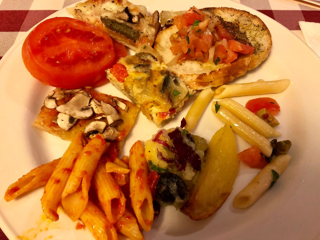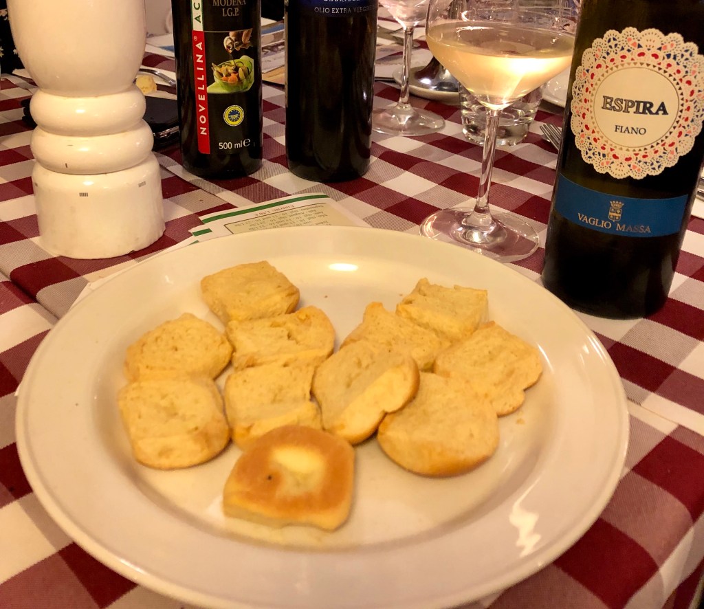 Irgendwann ist der Hase wieder da – wie meistens ohne Fische und wie selten in letzter Zeit hungrig. Deswegen laufen wir in eine nahegelegene Pizzeria und lassen uns dort frittierte Zucchini, Möhren und Blumenkohl sowie eine Pizza mit allem (der Hase) und einem Trüffelomelette (ich) schmecken. Dazu gab es einen halben Liter Grecchetto, den örtlichen Weißwein. Dann geht es wieder nach Hause und früh ins Bett, weiter ausruhen.